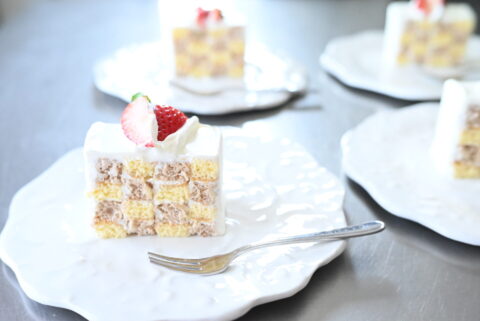 プレーンのスポンジと、フランボワーズの入ったほんのりピンク色のスポンジを組み立てて仕上げます。